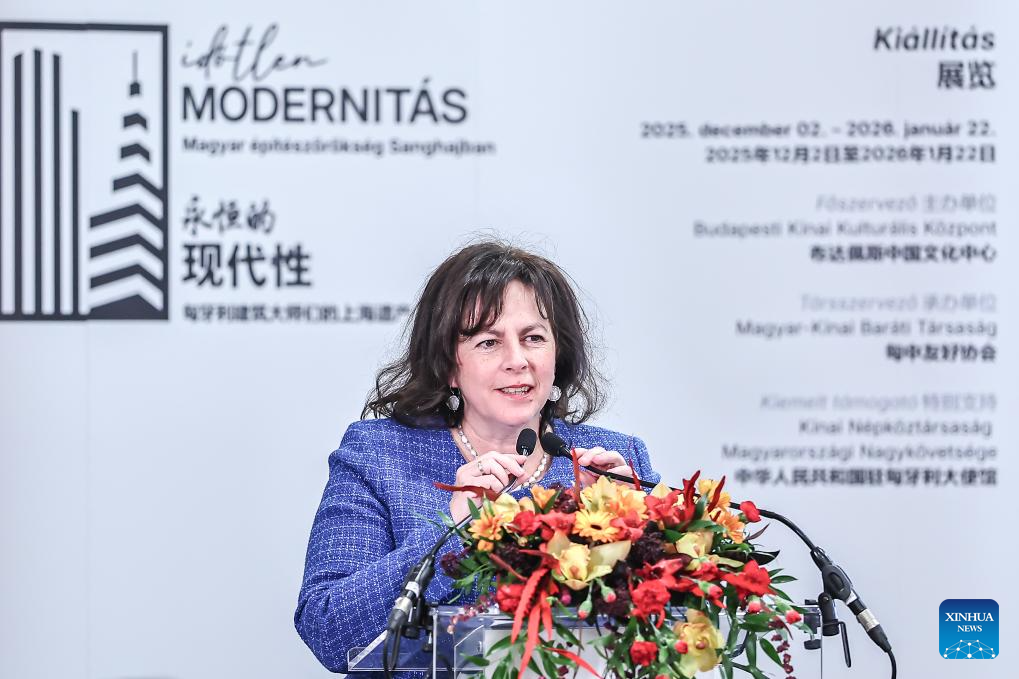 Judit Eva Nagy, presidente da Associação de Amizade Sino-húngara, discursa na cerimônia de abertura da exposição “Modernidade Atemporal – O Legado de Arquitetos Húngaros em Shanghai”, em Budapeste, Hungria, em 1º de dezembro de 2025. A exposição foi inaugurada em Budapeste na segunda-feira, destacando as contribuições de arquitetos húngaros para o desenvolvimento urbano de Shanghai na primeira metade do século 20.