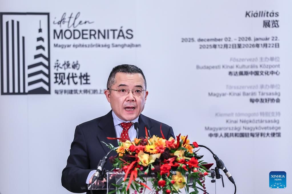 Istvan Jakab, vice-presidente da Assembleia Nacional da Hungria, discursa na cerimônia de abertura da exposição “Modernidade Atemporal – O Legado de Arquitetos Húngaros em Shanghai”, em Budapeste, Hungria, em 1º de dezembro de 2025. A exposição foi inaugurada em Budapeste na segunda-feira, destacando as contribuições de arquitetos húngaros para o desenvolvimento urbano de Shanghai na primeira metade do século 20.